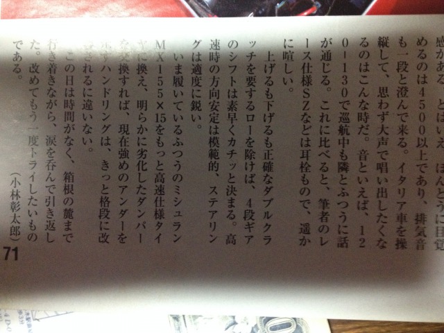 昨日の午後、割と早い時間に小林さんがお亡くなりになられたことを元NAVIのMさんに聞きました。Mさんは再来週、ご友人と小林さんを囲んでの昼食会を約束されていたようでした。なんか、胸が重苦しく、、ちょっとの時間話せなくなっていました。私の中の小林彰太郎さんは、、私が小林さんに初めてお会いしたのは第一回、コッパデ小海でした。アルビス3.5Lでヒルクライムをカッコよく走られていました。一緒に出ていたお客さんでもある友人がパンフレットにサインをもらいすごく喜んでいたのを思い出します。その表彰式で小林さんと並んで特別賞をいただいた写真があることが、素晴らしい思い出です。小林さんはガレージMMには数回いらっしゃったことがあります。そのうち何度かはGIULIETTA SZでいらしてました。試乗もさせていただきました。いろんなお話も聞かせていただきました。そんな中でも私のガレージに愛犬がいることを見ていただいて、アウトデルタのカルロッキティーが犬好きで事務所に犬がいたことを話されていました。また、小林さんのお仲間の車が入場しているとリフトの下に入り、楽しそうにいろんなことを話されていたことを思い出します。そして私の一番の小林さんの思い出は、NAVIの取材でOSCAで一緒に箱根まで行った思い出です。途中の会話は、緊張のあまりまったく覚えてませんが、ハンドルを握った小林さんの隣でOSCAでドライブしたことは一生の思い出です。残念ながら時間の都合上、箱根の入り口まで行って帰ってきました。小林さんは途中休憩することなくハンドルを握ってました。私がこんなことをいうのはものすごく失礼ですが、的確な無駄のない操作は流石の一言でした。都内に戻ってきてから運転を交代して二玄社迄戻りました。私の緊張はMAXで、おそらく、免許の卒業検定試験より緊張していたと思います。二玄社に戻って休憩していた時に他のスタッフさんに小林さんから嬉しい言葉をかけていただきました。これは我ながら恥ずかしいことなのですが、”宮内君は運転がうまいと”何度も言っていただきました。それは本当にお世辞でもうれしかったし、本当にいい思い出です。数年前にFIVA の車検に暑い中お会いして、持ち込んだ車のことをお話になったのが私は最後になってしまいました。小林さんは私の父と同じ年です、私の父は元気ですが、小林さんを拝見するたび父を思い出していたこともあります。小林さんがもしいなかったらCGもなかったし、日本の車趣味文化もこんなになっていなかったと思います。遠くにいた偉大な人でした。また一つの時代が終わったのかな~。ご冥福を心よりお祈りします。